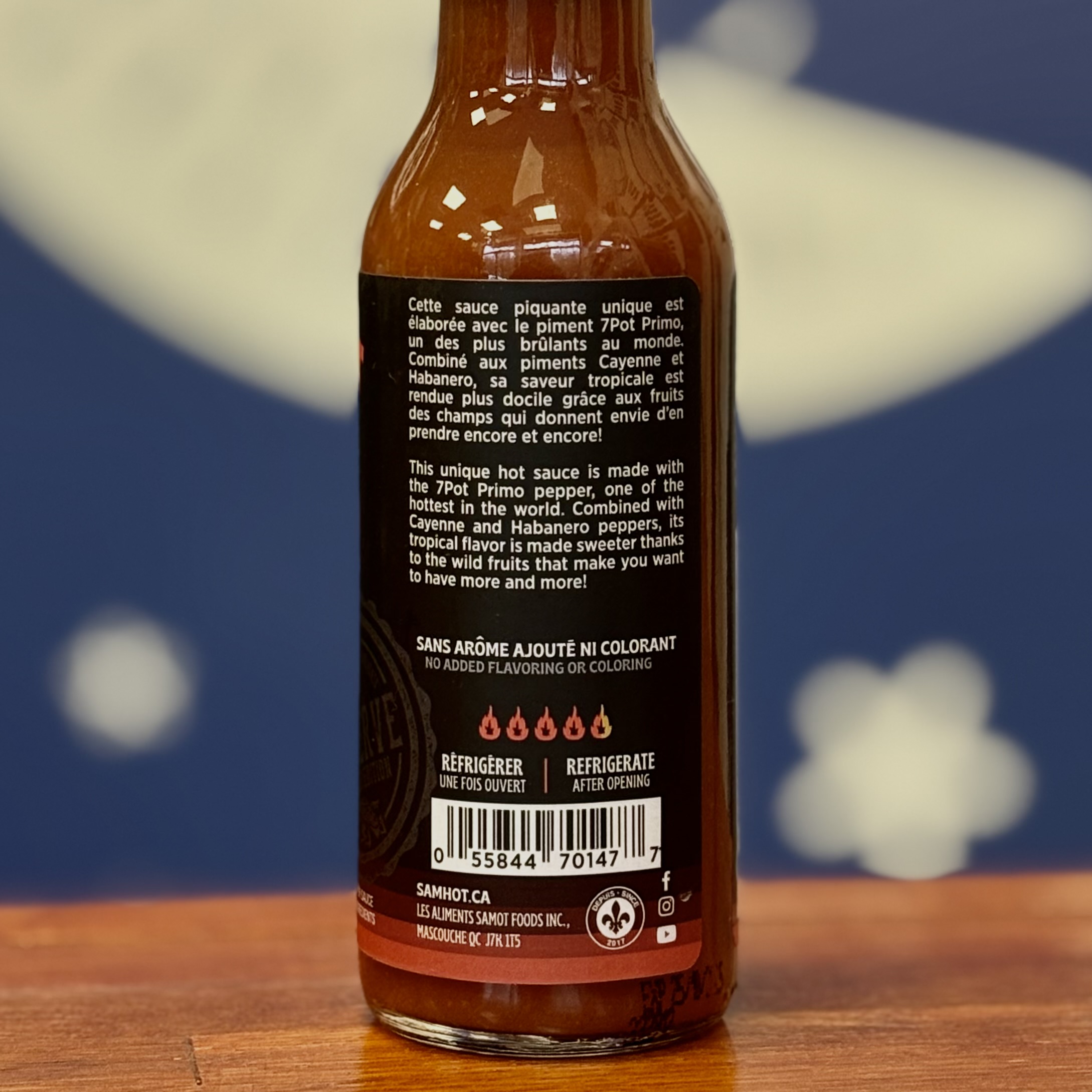 Cette sauce piquante unique est élaborée avec le piment 7Pot Primo, un des plus brûlantes au monde.