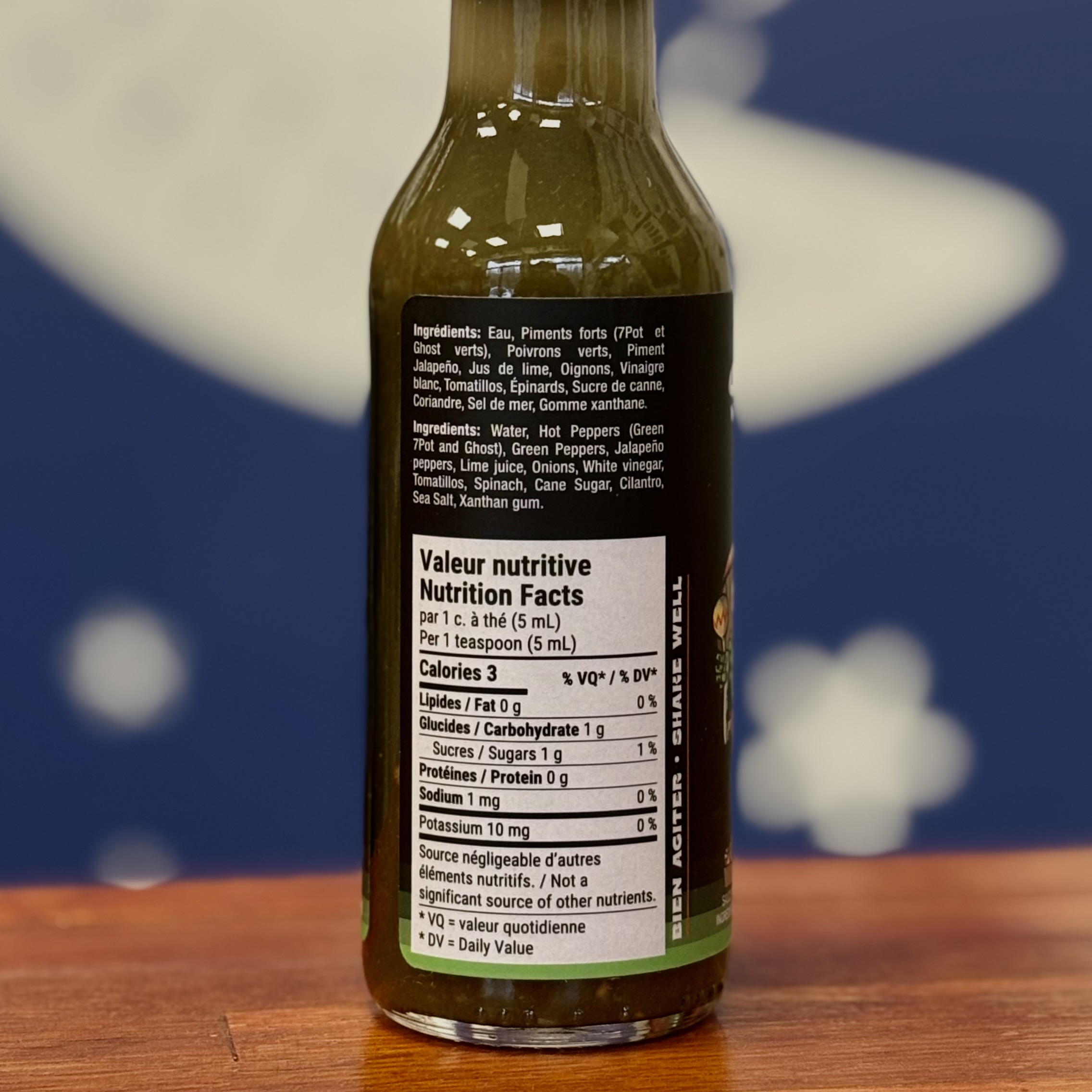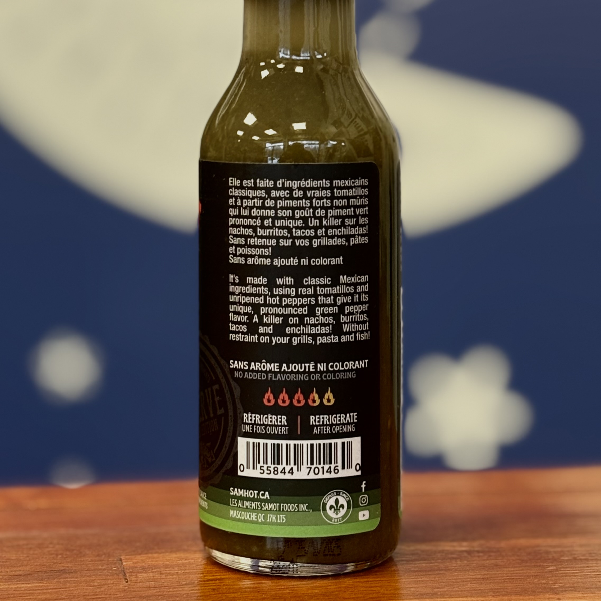 Elle est faite d’ingrédients mexicains classiques, avec de vrais tomatillos et à partir de piments forts non mûris qui lui donne son goût de piment vert prononcé et unique.